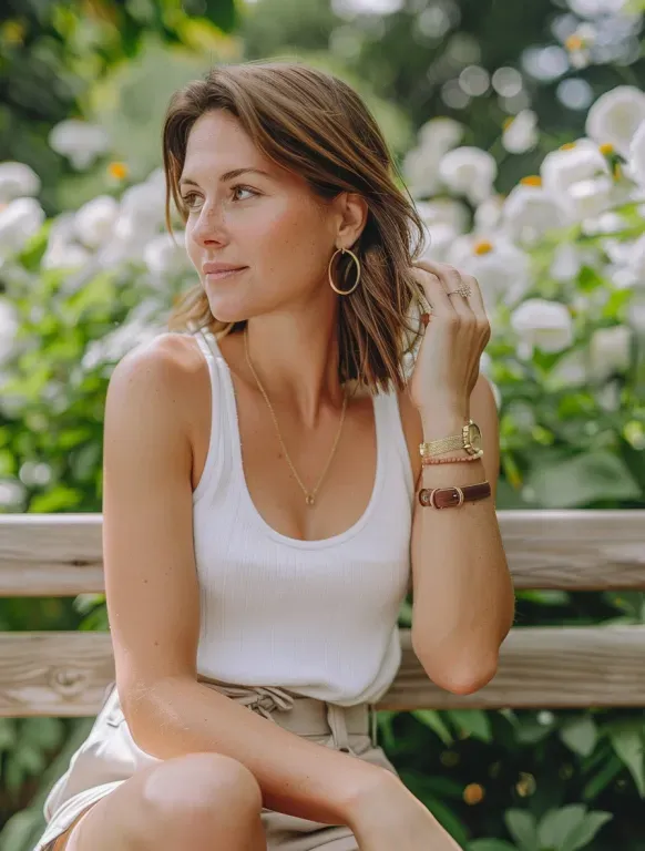 What I love most about this outfit is how it mixes simplicity with chic details. The white tank is a classic that works for any occasion, while the beige shorts add a polished, relaxed touch. The gold accessories bring in a bit of glamour without feeling over-the-top, making this perfect for a casual day out or even a coffee date. It’s the kind of outfit that looks effortlessly put together and feels as comfortable as it looks definitely a must-have for those sunny days when you want to look fabulous without any fuss!