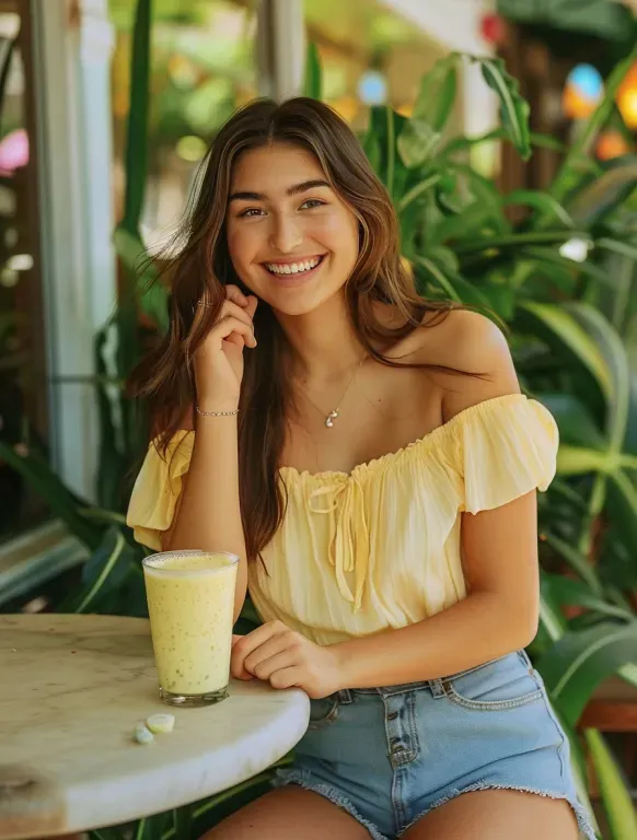 This outfit is all about that fresh, sunny vibe. A cute, off-the-shoulder yellow blouse adds a pop of color, paired perfectly with light denim shorts that have a casual, easy fit. The soft ruffles on the blouse bring a feminine touch, while the relaxed shorts keep it comfortable and breathable. The simple accessories gold jewelry and a light smile make it feel effortless, and the refreshing drink in hand adds to the warm, relaxed atmosphere.