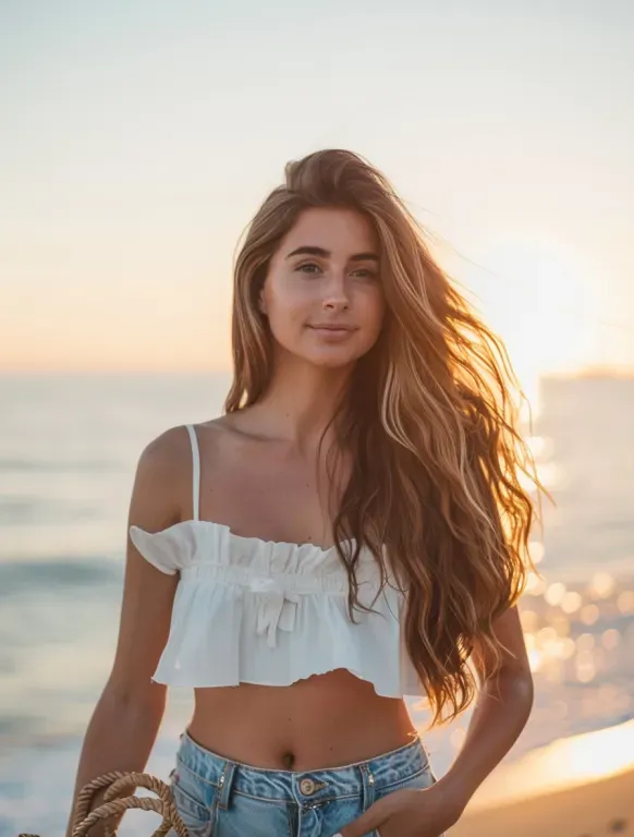 This outfit exudes effortless beachy vibes. A white, off-the-shoulder blouse with a delicate ruffle detail complements the relaxed look of high-waisted denim shorts. The outfit is accessorized with a stylish straw tote bag, perfect for carrying a few beach essentials. The soft, wavy hair and natural makeup complete the laid-back, sun-kissed look that feels as fresh as a coastal breeze.