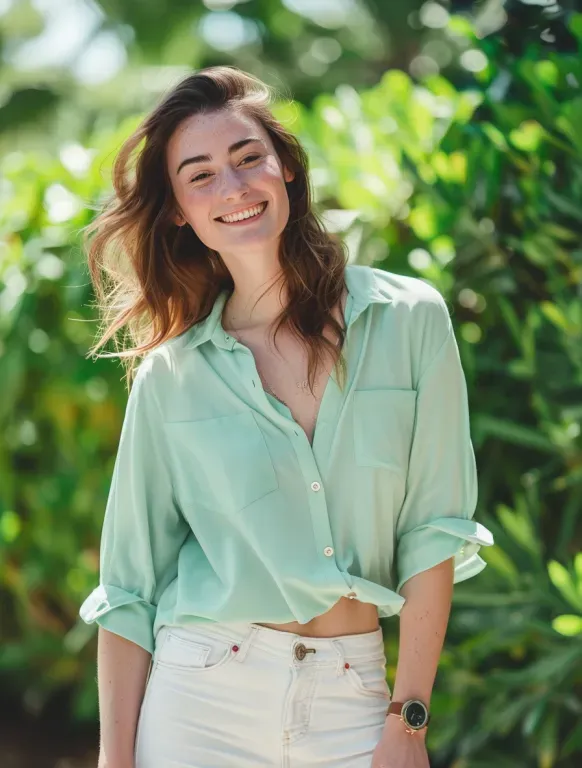 This outfit has a fresh, light vibe that s perfect for any sunny day. The soft mint green blouse is buttoned down the front with rolled-up sleeves, creating a relaxed, chic look. Paired with white high-waisted shorts, it s a simple yet stylish combination that keeps things effortless and cool. The outfit is completed with a sleek watch and an easygoing smile, perfect for a stroll or a casual hangout.