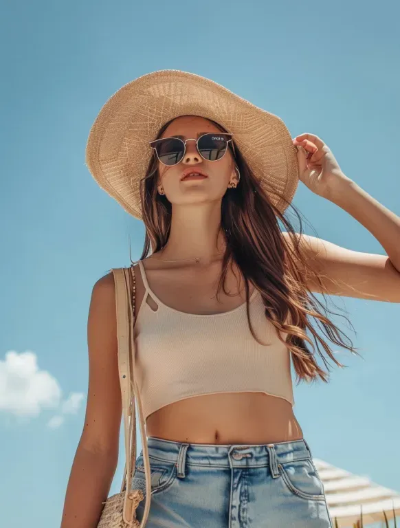 This outfit captures that perfect blend of easygoing beach style and modern flair. A simple beige crop top with a ribbed texture is paired with high-waisted, distressed denim shorts, giving it a casual, laid-back feel. The straw hat adds a beachy touch, while the chic sunglasses and woven bag bring the outfit together, making it perfect for a sunny day by the beach or a stroll through a coastal town.