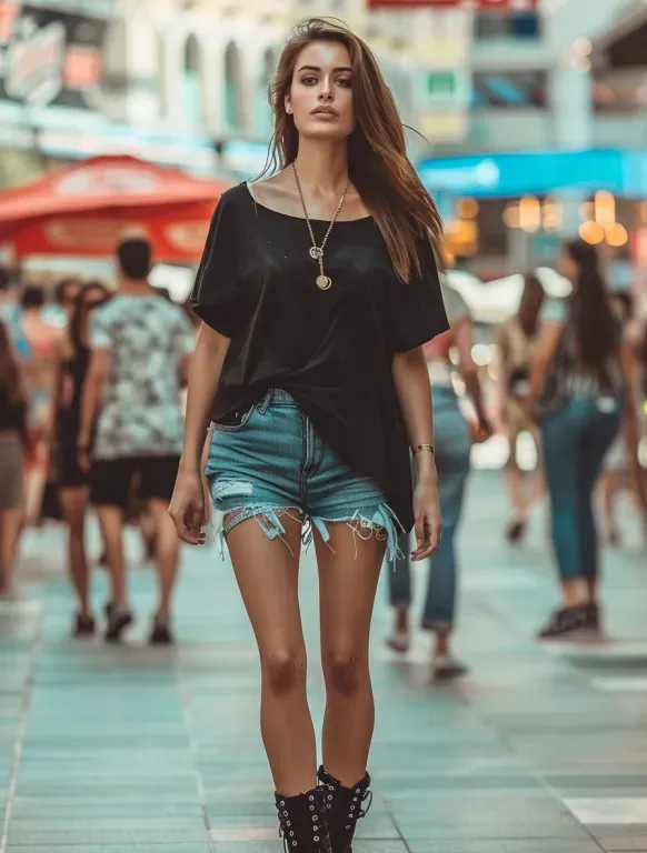 This outfit is perfect for anyone looking to add a bit of an edge to their summer wardrobe. A black oversized t-shirt is paired with distressed denim shorts, giving the outfit that relaxed, urban vibe. The look is elevated with chunky black boots, which add a bold contrast to the softness of the shirt and shorts. A simple necklace complements the look without taking away from the overall casual yet cool aesthetic.