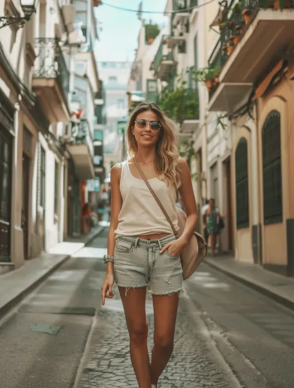 This outfit is all about embracing simplicity while still looking effortlessly chic. A basic white tank top is paired with light wash denim shorts that feature a clean, tailored look. The addition of white sneakers gives the outfit a casual vibe, while a neutral handbag adds just the right touch of style. The whole look is perfect for a stroll through a charming city street or a casual outing with friends.