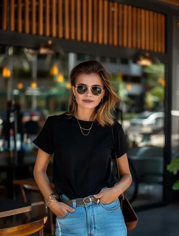 I love how this outfit combines simplicity with subtle details that elevate the overall look. The black t-shirt is such a versatile piece, and knotted at the waist, it adds a bit of edge without overdoing it. The denim shorts are classic and flattering, and the accessories like the belt and sunglasses give the outfit a more polished feel. It s the kind of easy, laid-back outfit you can wear anywhere from casual outings to a coffee date. Definitely a go-to for anyone who loves looking effortlessly stylish!