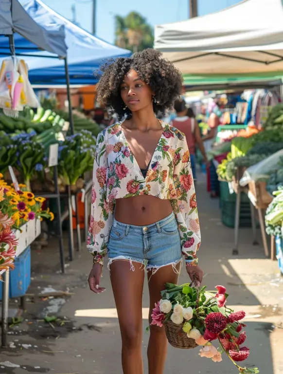This outfit is all about combining a laid-back summer vibe with a touch of boho flair. A floral cropped blouse with a deep V-neckline gives it a free-spirited, relaxed look, while high-waisted distressed denim shorts keep things casual and comfortable. The strappy sandals add an extra touch of bohemian charm, and the basket of flowers in hand completes the look, making it perfect for a stroll through a market or a sunny day outdoors.