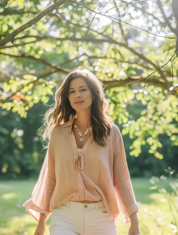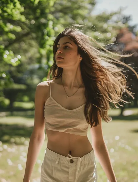 This outfit perfectly captures that effortless, laid-back summer vibe. A simple beige cropped tank top is paired with soft, ivory high-waisted shorts that have a relaxed, comfortable fit. The drawstring waist adds a cute touch, and the lightweight material makes it perfect for those hot, sunny days. The natural beauty of the outdoors and the wind gently blowing through her hair adds to the effortless charm of this look.