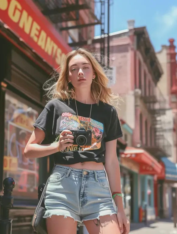 This outfit channels a cool, urban vibe perfect for summer explorations. The oversized graphic t-shirt is paired with distressed high-waisted denim shorts, giving it a relaxed and retro feel. The look is completed with simple white sneakers and accessories like a camera and bracelets, giving it a laid-back, street-style twist. The backdrop of the city adds to the effortless charm of the whole look.