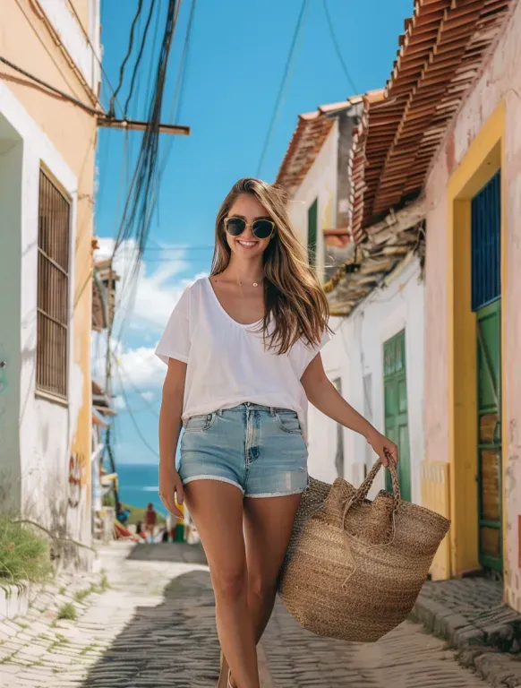 This outfit is the epitome of casual, laid-back style perfect for those warm summer days. A simple white v-neck t-shirt is paired with high-waisted denim shorts, giving it a fresh, easygoing vibe. The look is accessorized with a large straw bag, which adds a touch of boho flair, and strappy sandals that complete the summer-ready feel. Sunglasses and a big smile finish off the effortless charm of the outfit.