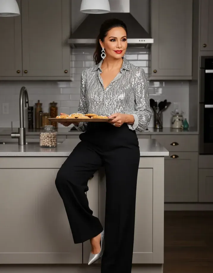 This outfit is pure holiday glam with a classy twist. The star of the show is a shimmering silver sequin blouse that brings just the right amount of dazzle without being too much. It s paired with elegant high-waisted black trousers that flow beautifully and balance out the sparkle. Matching silver heels and statement earrings pull the look together like it was made for clinking champagne glasses and passing cookie trays.