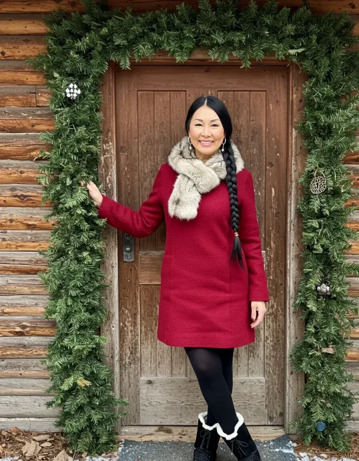 This outfit is giving cozy cottage dreams in the best way. She s bundled up in a bright cranberry red wool coat, paired with black tights and the cutest black winter boots trimmed in faux fur. The real showstopper, though, is that luxurious faux fur scarf wrapped snug around her neck. The whole look is festive, functional, and totally charming for a day spent at a snowy cabin or sipping something warm by the fire.