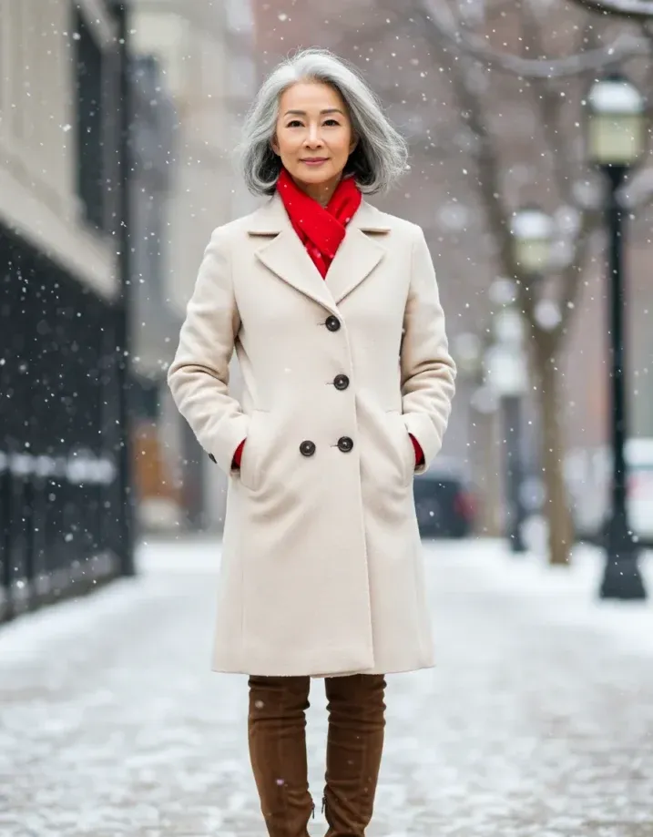 This look is all about timeless winter sophistication. She s wearing a beautifully tailored cream wool coat that hits just above the knees, paired with rich brown suede knee-high boots. The standout detail? That bold red scarf tucked in perfectly at the neckline. The outfit is sleek, warm, and ideal for chilly city strolls with a touch of holiday charm swirling in the snow.