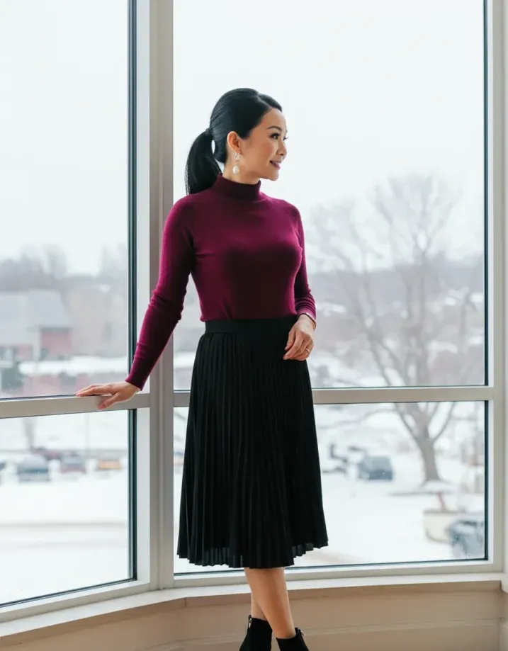 This outfit is the picture of graceful minimalism. She s wearing a fitted burgundy sweater tucked into a classic black pleated midi skirt that flows with every step. Black ankle boots give the look a modern finish, while pearl drop earrings add just a touch of soft sparkle. The palette is rich and wintery, perfect for snowy days spent indoors with good company and warm drinks.