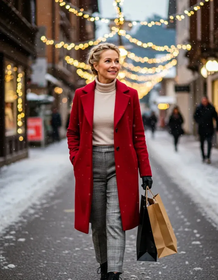 This outfit is city-chic with a festive twist. She s wearing a bold red tailored coat that instantly turns heads, layered over a soft beige turtleneck. The look is pulled together with slim plaid trousers, black lace-up boots, and gloves that add a little edge while keeping things practical. Shopping bags in hand, she s clearly on a holiday mission and looking fabulous doing it.