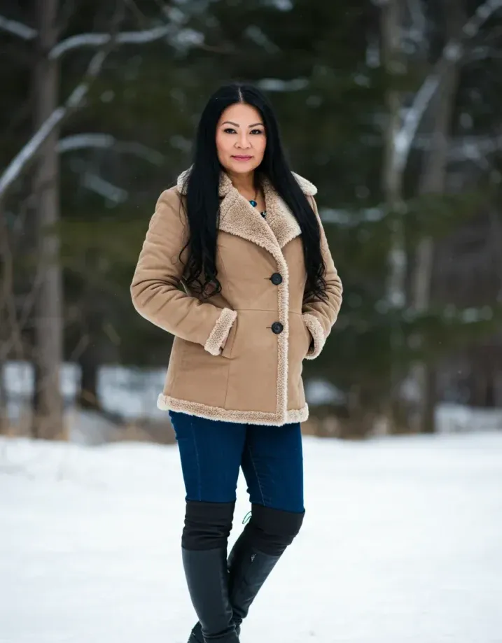 This outfit is a winter classic that s both functional and stylish. She s wearing a tan shearling-lined coat that looks incredibly warm, paired with deep blue skinny jeans and black over-the-knee boots that mean serious snow business. The coat s texture adds that cozy touch we all crave when the temps drop, and the sleek boots keep the whole look feeling modern and put-together.