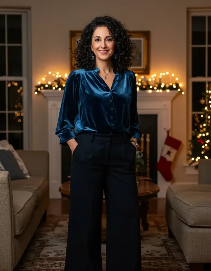 This outfit is all about soft elegance with a cozy holiday touch. She s wearing a silky velvet button-up blouse in a deep midnight blue that looks rich and plush under the warm glow of holiday lights. It s tucked into a pair of high-waisted, wide-leg black trousers that add movement and polish. She finishes the look with metallic silver ballet flats and delicate jewelry for a subtle bit of sparkle.