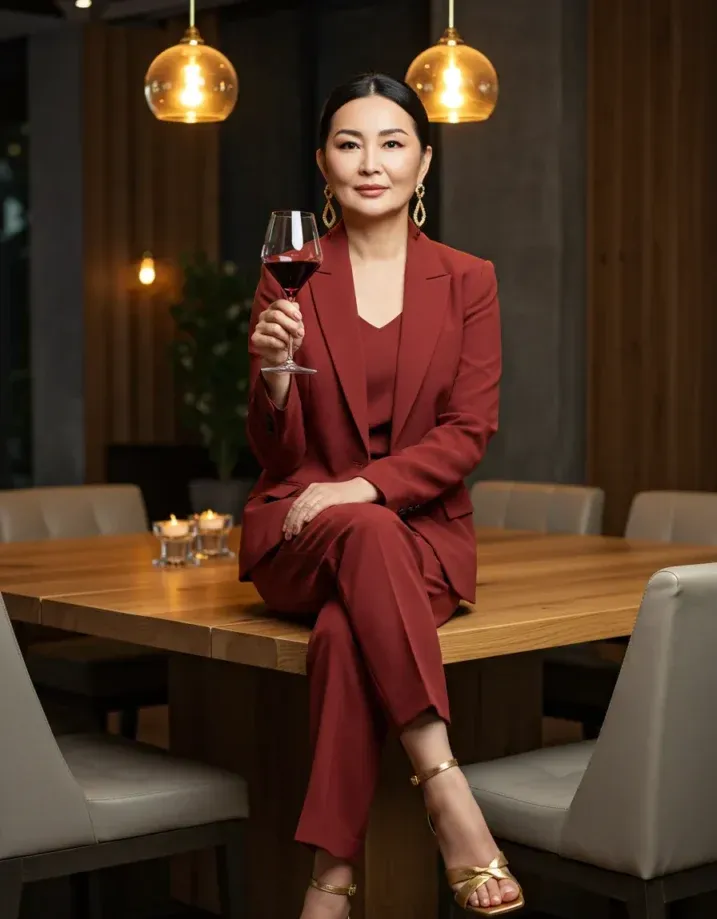 I absolutely love how commanding and confident this look feels. A matching suit in a deep color like burgundy is such a vibe, and adding gold accessories makes it instantly holiday-ready. It s what I d wear to a fancy dinner or upscale gathering where I want to make a statement without even raising my voice. This look says I ve arrivedâ with nothing but grace.