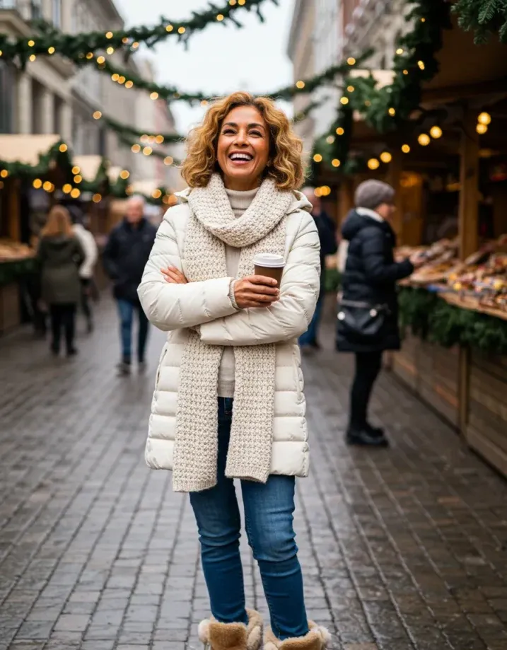 This outfit is winter coziness at its cutest. She s wrapped up in a cream puffer coat over a matching knit sweater and chunky scarf, paired with blue skinny jeans and the softest-looking tan shearling boots ever. The whole vibe is casual, warm, and perfect for walking through holiday markets with a hot drink in hand and a big smile on your face.