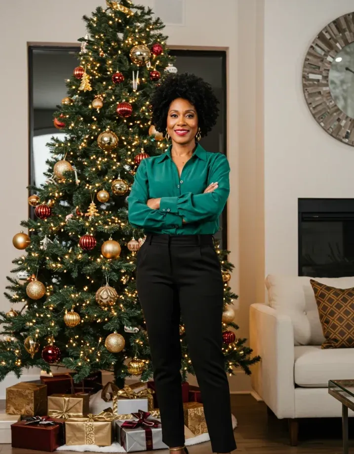 This outfit brings together a rich emerald green satin blouse with sleek black tailored pants for a clean and classy holiday look. The blouse has a soft sheen that catches the light just enough, while the tapered pants add structure and polish. She s paired the look with gold strappy heels and bold earrings, which really pull in the sparkle from the tree behind her. It s one of those outfits that looks festive without going full-on Santa mode.