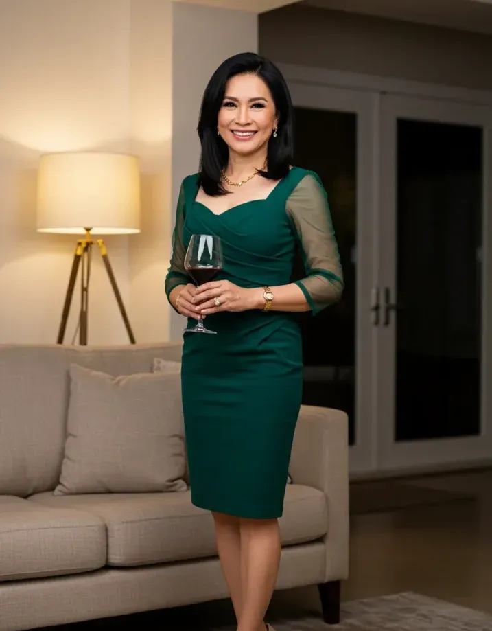 This look is the definition of classic Christmas elegance. She s wearing a deep burgundy velvet wrap dress with three-quarter sleeves and a flattering tied waist. The soft sheen of the fabric adds just the right amount of luxury, and she finishes the look with sparkly chandelier earrings and gold pointed-toe heels. With a glass of bubbly in hand and a smile that lights up the room, she s holiday-ready in the chicest way.