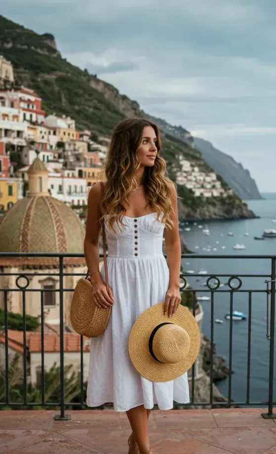 This outfit screams effortless elegance, perfect for the stunning Amalfi coast. A simple yet chic white sundress with button detailing and a flattering waist tie creates a timeless, feminine silhouette. Paired with neutral gladiator sandals, a woven straw bag, and an oversized sun hat, this look is ideal for a sunny day strolling through a quaint Italian town or lounging by the Mediterranean. The dress’s light fabric offers comfort and breathability, making it a go-to summer choice for any occasion.