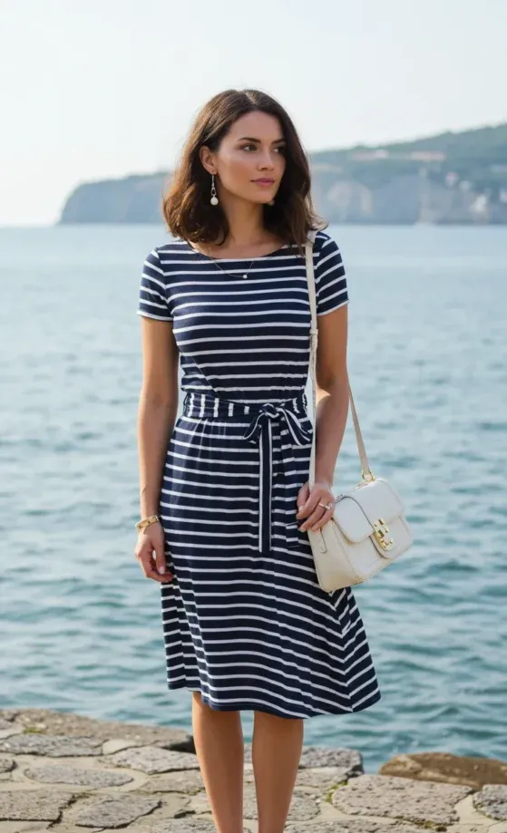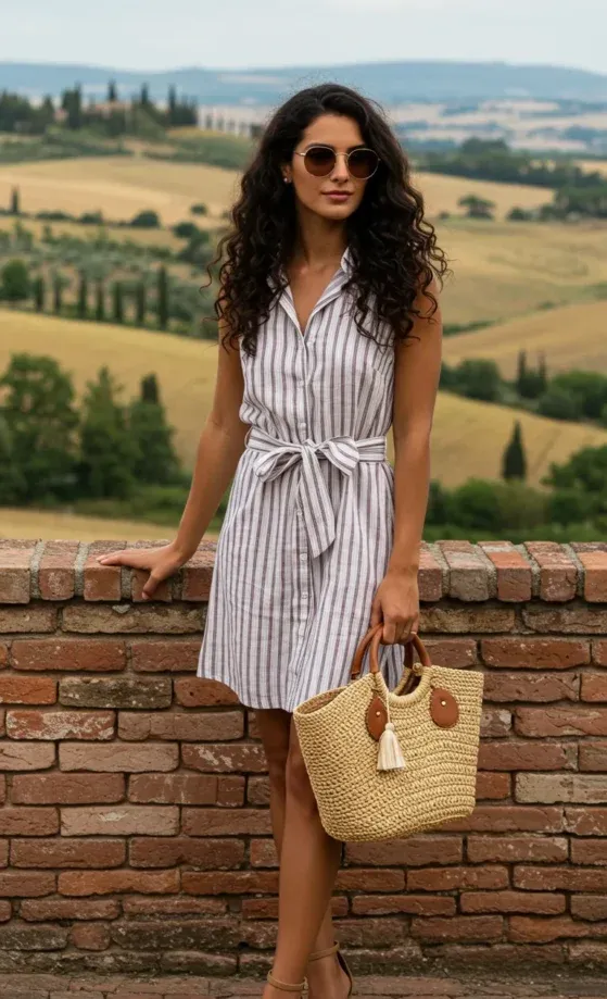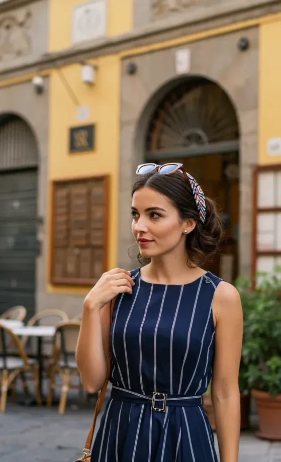 This charming striped dress is the perfect choice for a relaxed yet stylish day in Italy. The dress features a flattering fit with a subtle belt at the waist that accentuates your figure. The classic navy and white stripes give it a nautical, fresh vibe, while the sleeveless design ensures comfort in the warm summer weather. Paired with a simple handbag and a chic headband, this outfit is both fashionable and effortless, making it ideal for a city stroll or a casual brunch.