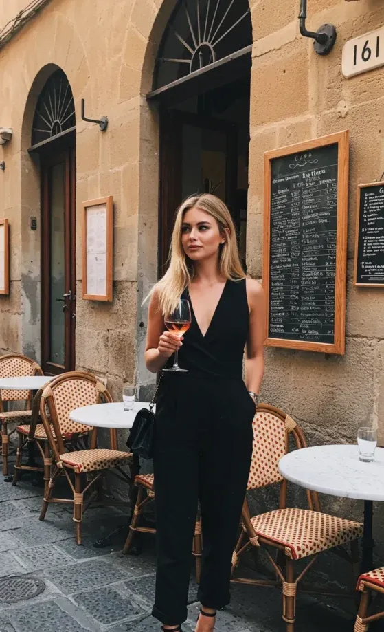 This stunning black jumpsuit is perfect for those evening strolls in Italy when you want to feel chic yet comfortable. The V-neckline and waist-cinching design create a flattering silhouette, while the relaxed fit keeps it easy and breezy. Paired with simple black heels and a stylish crossbody bag, this outfit is sophisticated enough for an evening drink or a romantic dinner. The deep black color makes it a versatile piece for any occasion, and the classic styling ensures you ll never go out of fashion.