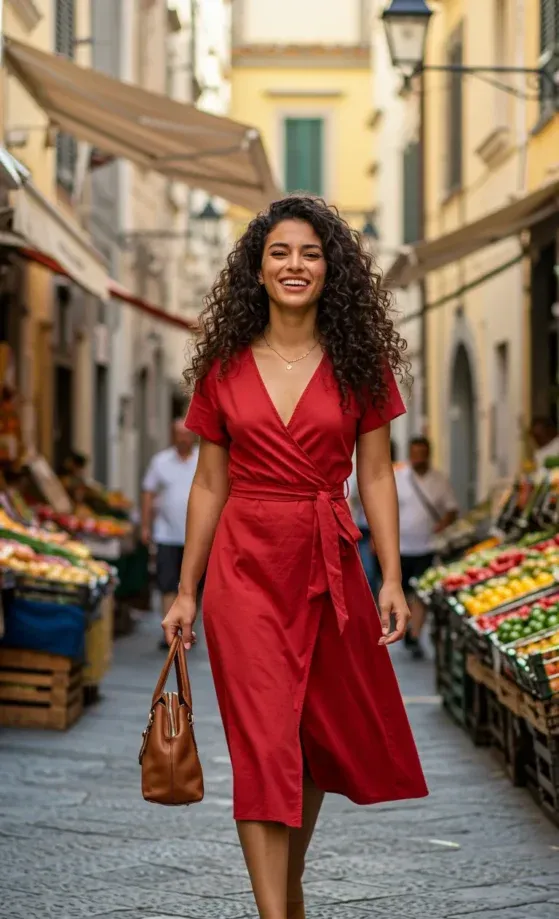 This stunning red wrap dress is a statement piece that exudes effortless chic. The dress features a flattering V-neckline and a waist-cinching tie that accentuates the figure, making it perfect for a sunny day out in Italy. The vibrant red hue adds a bold pop of color, and the lightweight, flowy fabric ensures comfort while walking around the picturesque streets. Paired with simple sandals and a neutral handbag, this outfit strikes the perfect balance between stylish and laid-back.