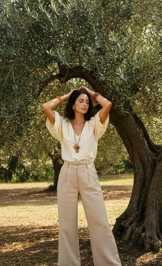 This gorgeous boho-inspired look is perfect for an afternoon exploring the Italian countryside. The outfit features a loose, airy cream blouse with a relaxed fit, paired with high-waisted, wide-leg beige trousers that flow beautifully as you move. A statement necklace and stacked bracelets add a pop of personality, while the simple sandals keep the look comfortable and stylish. The natural tones of the outfit blend seamlessly with the olive tree backdrop, making it the ideal choice for a sunny day in the Italian countryside.