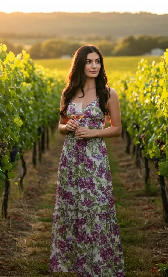 This charming floral dress is the epitome of effortless summer style. The dress features a flattering V-neckline and delicate spaghetti straps, making it both comfortable and stylish. With its soft floral print in shades of purple and green, it s perfect for a leisurely afternoon spent sipping wine in a vineyard. The lightweight fabric flows beautifully, adding a touch of romance to the outfit. Paired with simple sandals and a glass of rosé, this look is ideal for those warm Italian days.