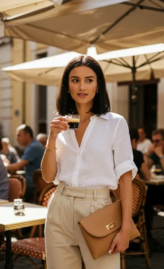 This sophisticated yet casual look is perfect for a day of exploring Italy s charming streets. The crisp white button-down shirt paired with high-waisted beige trousers creates an effortlessly chic vibe. The addition of a tan clutch bag and simple gold accessories like a delicate bracelet complete the look. Whether you re sipping an espresso at a café or strolling through the city, this outfit exudes a timeless and elegant vibe.