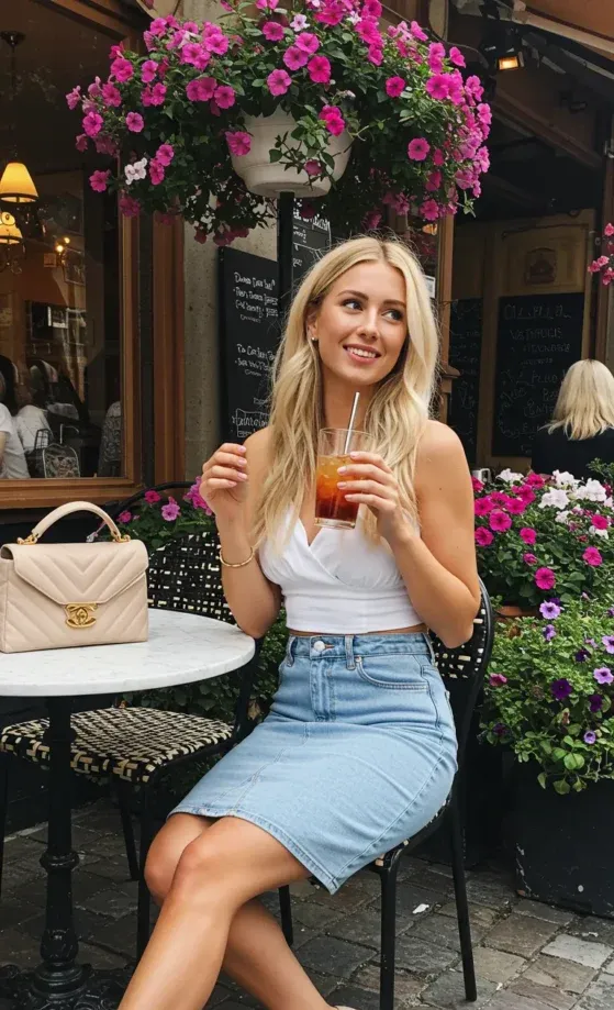 This cute and casual outfit is perfect for enjoying a drink at a charming café in Italy. The white wrap top adds a fresh, feminine touch, while the high-waisted light blue denim skirt is both comfortable and flattering. The addition of neutral beige slip-on shoes and a stylish Chanel bag adds a touch of elegance without compromising on comfort. With a coffee in hand and a gorgeous café backdrop, this outfit strikes the perfect balance between casual chic and laid-back sophistication.