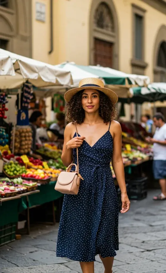 This navy polka dot wrap dress is a quintessential Italian summer look, perfect for a visit to a local market. The soft, lightweight fabric moves beautifully, creating an easy, relaxed silhouette that s both stylish and comfortable. The dress features a flattering V-neckline and a cinched waist, giving it a feminine, yet laid-back charm. Paired with white sandals, a chic crossbody bag, and a straw hat, this outfit is all about casual elegance and effortless style.