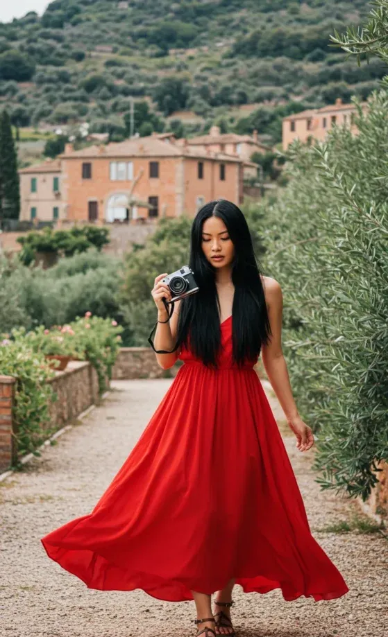 This eye-catching red dress is the perfect blend of elegance and ease, ideal for any sun-filled day in Italy. The dress features a flattering sweetheart neckline with a flowing A-line cut, creating a silhouette that s both relaxed and feminine. The lightweight fabric flows gracefully, making it perfect for a walk through picturesque streets or a stop for photos in the countryside. Paired with simple sandals and a camera, this look is all about effortless style and a touch of adventure.