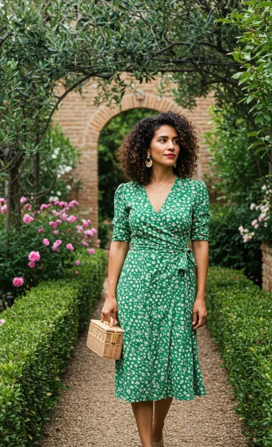 This green floral wrap dress is the perfect combination of elegance and charm, ideal for a sunny Italian afternoon. With its flattering v-neckline, tie waist, and flowy midi skirt, the dress creates a feminine and relaxed silhouette. The white daisy print adds a playful touch, while the soft fabric ensures comfort throughout the day. Paired with beige sandals and a cute woven basket bag, it s a dreamy look for wandering through gardens or enjoying a relaxed lunch in the countryside.