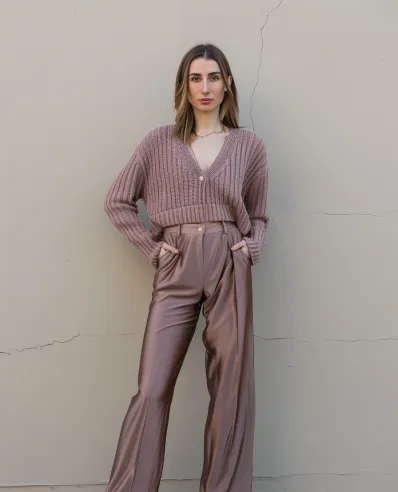 This outfit is a perfect blend of cozy and chic. The dusty mauve cropped knit sweater adds warmth and texture, while the high-waisted satin trousers provide a sleek, luxurious contrast. Nude heels elongate the silhouette, giving the look a polished finish without being too formal. The muted, tonal palette ties everything together beautifully.