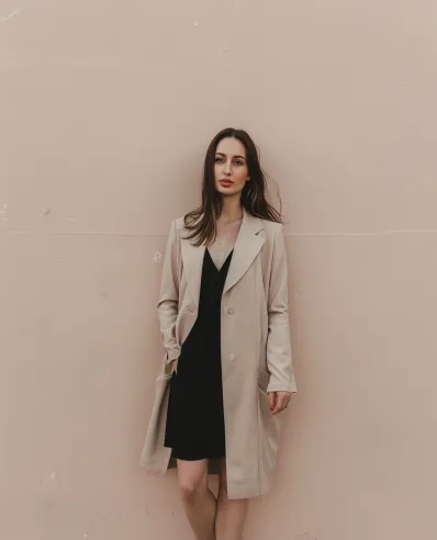 This outfit showcases timeless elegance with a hint of edge. A beige trench coat adds sophistication and structure, while the black slip dress keeps things sleek and minimal. The unexpected twist? Black ankle boots that lend a bit of attitude and practicality to the ensemble. Together, the neutral palette creates a refined, versatile look.