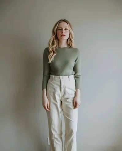This outfit is a masterclass in effortless simplicity. A fitted sage green sweater adds warmth and soft color, while the high-waisted off-white pants provide a clean, structured contrast. The neutral tones are complemented by subtle beige ankle boots, creating a grounded yet sophisticated aesthetic. Everything about this look feels polished but approachable.