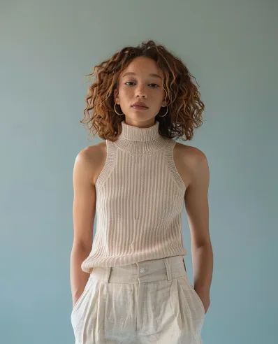 This outfit is the epitome of relaxed elegance. The ribbed high-neck sleeveless top, in a soft beige tone, offers a clean and minimal look. Paired with high-waisted, wide-leg linen pants, the ensemble feels breezy and effortlessly chic. The light, airy fabrics make this perfect for a warm museum visit or a day spent exploring creative spaces.