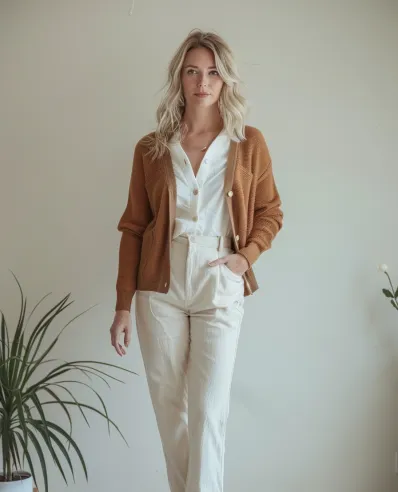 This outfit feels both relaxed and polished. The warm caramel-colored cardigan adds a cozy layer, while the crisp white button-up blouse underneath keeps it refined. High-waisted cream trousers bring structure and elegance, perfectly balancing the softness of the knit. Nude heels add a subtle, sophisticated touch that completes the neutral-toned palette.