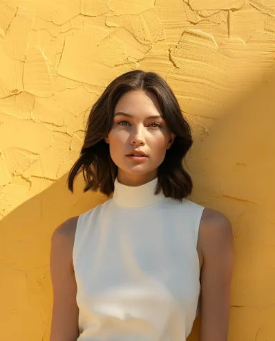 This outfit is pure minimalism at its best. The sleeveless high-neck white top offers a clean and elegant look, while its sleek silhouette is both flattering and timeless. Paired with what I imagine to be high-waisted black trousers or a chic midi skirt, this combination has a sophisticated, modern edge. The contrast of light and dark tones makes it effortlessly eye-catching.