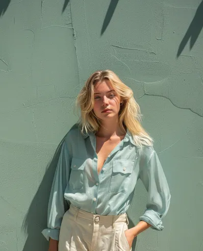 This outfit exudes effortless summer charm. The light blue button-up shirt, with its relaxed fit and rolled-up sleeves, feels airy and comfortable. It s perfectly paired with high-waisted cream-colored shorts, offering a crisp and polished contrast. The outfit is simple yet elevated, ideal for warm days filled with exploration.