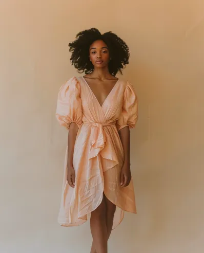 This peach-toned wrap dress is a stunning combination of drama and grace. The exaggerated puff sleeves bring a bold, fashion-forward element, while the cinched waist and flowing, asymmetrical hem create a soft, romantic silhouette. The deep V-neckline adds a touch of allure without being too much, and the nude strappy heels tie the whole look together with elegance.