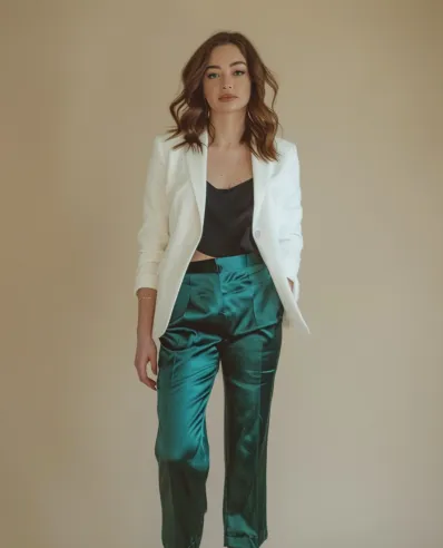 This outfit strikes the perfect balance between elegance and trendiness. A crisp white blazer elevates the look with a touch of sophistication, while the rich emerald green satin pants bring in a luxe, eye-catching element. Underneath, a simple black cami keeps things chic and versatile. Strappy silver heels complete the ensemble, adding just the right sparkle for a polished finish.