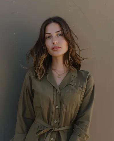 This olive green button-up dress combines comfort and sophistication effortlessly. With its soft utility-inspired design and waist-defining belt, it flatters your shape while keeping things casual and relaxed. The rolled-up sleeves add a laid-back touch, and the earthy tone complements natural lighting beautifully. Minimal accessories, like a delicate necklace, are all you need to finish off this chic yet understated look.