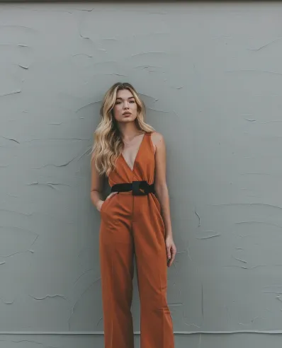 This burnt orange jumpsuit is a total power move. The deep V-neckline and cinched black belt create a striking silhouette that flatters your waistline. With wide-leg trousers and a sleeveless design, the jumpsuit feels both elegant and modern. Classic black pointed-toe heels give the outfit a polished finish, perfect for stepping into a stylish museum atmosphere.