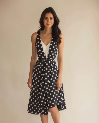 This navy-blue wrap dress with white polka dots is a classic yet fun choice. The V-neckline is both flattering and feminine, while the cinched waist creates a beautiful, hourglass silhouette. Layered over a white cami, the dress offers just the right amount of coverage. Paired with nude strappy heels, the outfit is elegant and effortlessly playful.