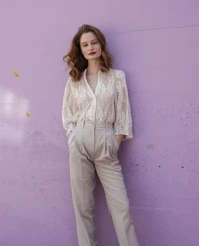 This outfit blends delicate and structured elements beautifully. The sheer lace blouse adds a romantic touch with its intricate detailing and relaxed fit. It’s tucked into tailored beige high-waisted trousers, which offer a polished contrast and highlight your waist. The look is completed with pointed nude heels, enhancing the graceful, elongated silhouette.
