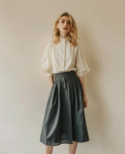 This outfit blends vintage charm with modern elegance. The high-collared white blouse, with its soft puffed sleeves, adds a touch of refinement. It’s paired with a dark pleated midi skirt that creates a beautifully structured silhouette. Classic black ankle-strap heels complete the ensemble, adding just the right amount of sophistication.