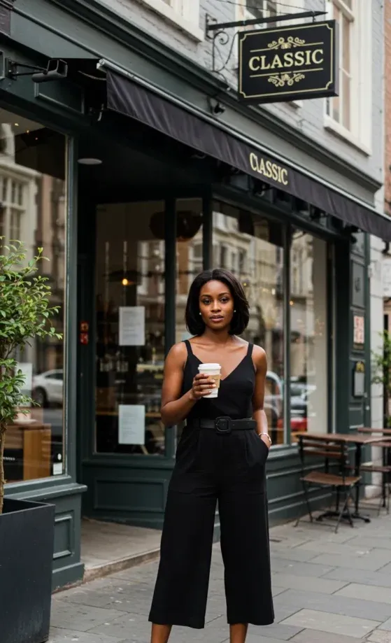 This black jumpsuit is the epitome of chic simplicity. The sleeveless design with adjustable straps gives it a relaxed yet stylish look, while the high-waisted, wide-leg cut ensures comfort and movement. The addition of a sleek belt accentuates the waist, making it flattering for any body type. Paired with metallic silver sandals and a coffee cup in hand, this outfit is perfect for a casual but elevated day out in the city.