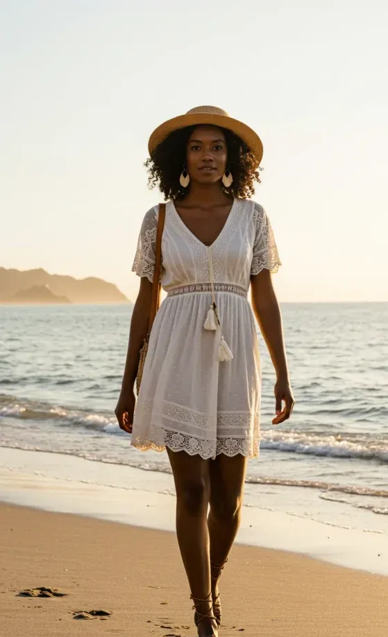 This breezy white boho dress is perfect for a day at the beach or a laid-back outdoor summer event. The dress features a delicate lace trim, a deep V-neck, and playful tassel ties that add a touch of bohemian charm. The flowy silhouette and short sleeves keep it comfortable and effortless, while the oversized straw hat and tan gladiator sandals complete the look for a relaxed, beachy vibe.